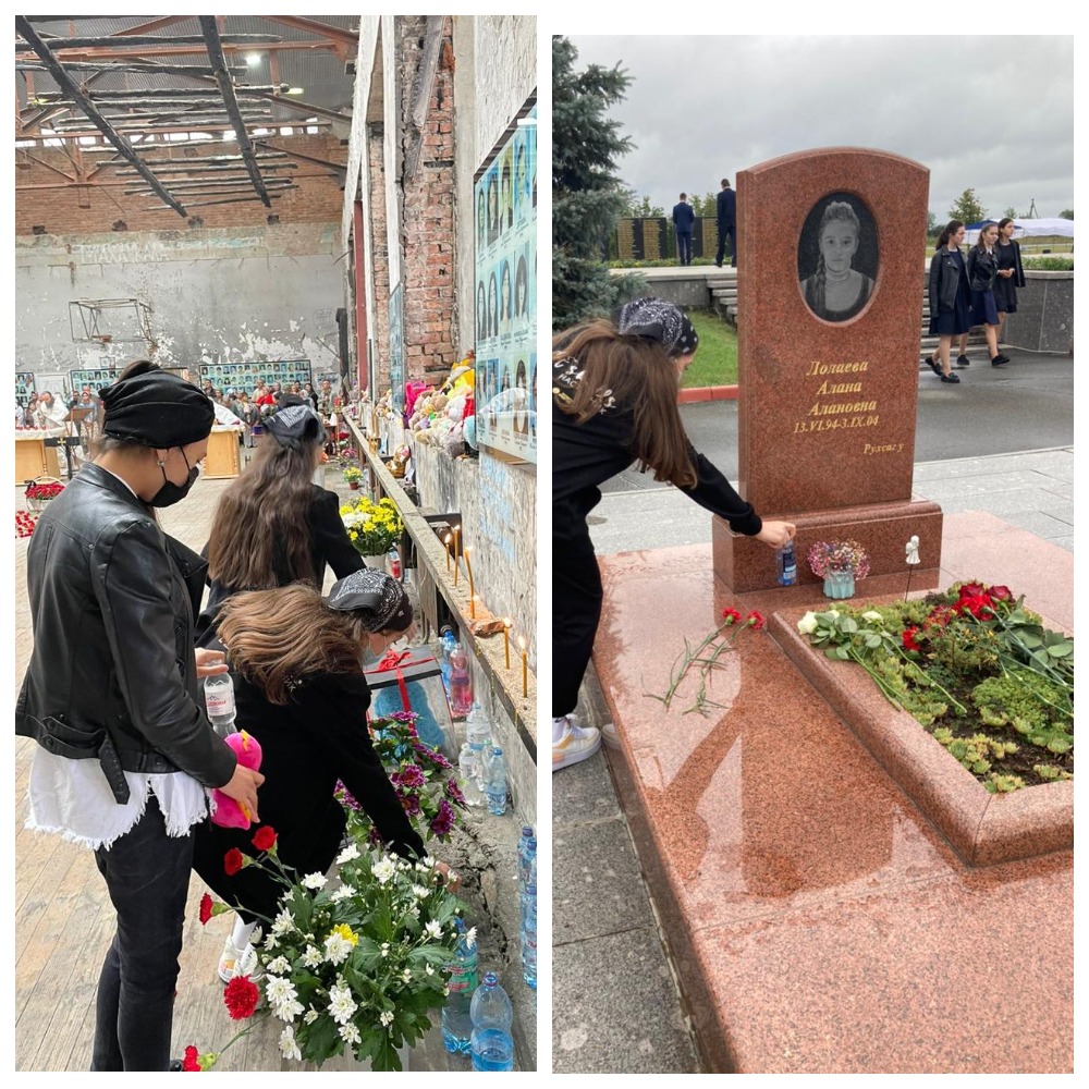 Затем учащиеся и педагоги возложили цветы на мемориальном кладбище «Город Ангелов», где покоятся 266 жертв теракта. Там же находится композиция «Древо скорби», символизирующая матерей, поднявших к небу своих детей. Этот памятник стал олицетворением человеческой боли и вечного напоминания о ценности жизни и мира.